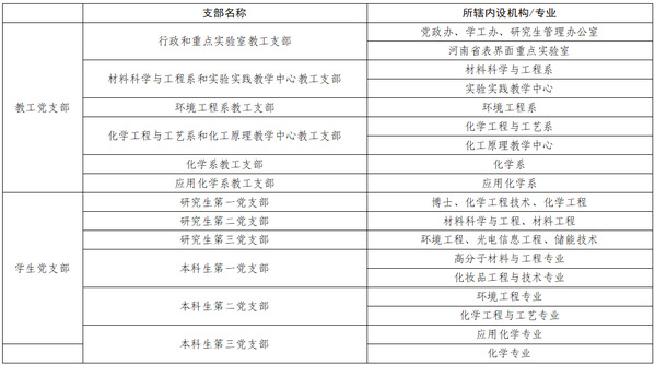 材料与化学工程学院党委下属12个党支部,其中教工党支部6个,分别是行政和重点实验室教工党支部、材料科学与工程系和实验实践教学中心教工党支部、环境工程系教工党支部、化学工程与工艺系和化工原理教学中心教工党支部、化学系教工党支部、应用化学系教工党支部;学生党支部6个,分别是本科生第一党支部、本科生第二党支部、本科生第三党支部、研究生第一党支部、研究生第二党支部、研究生第三党支部。